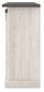 | Details | Made of engineered wood and decorative laminate, Antique white finish, Top with replicated gray wood grain, Metal brackets and hardware, Pair of sliding barn doors, 2 adjustable center shelves; 4 side shelves, Cross-buck details, Cutouts for wire management, Assembly required | |